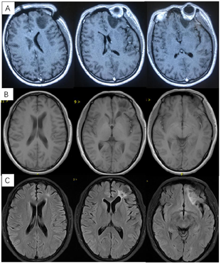 患者20年前患者体检时发现颅内占位性病变,行伽玛刀治疗,间断复查,病情稳定(图1)。20天前患者无明显诱因出现抽搐一次,伴意识丧失,持续约15分钟后逐渐恢复,至我院门诊行MR示"左侧额叶占位性病变",门诊以"颅内占位性病变"收治入院。