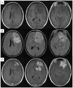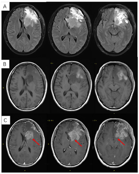 入院体格检查:T:36.8℃,P:69次/min,R:19次/min,BP:125/88 mmHg。专科体格检查:神志清楚,对答切题。双侧瞳孔等大等圆,直径约3 mm,对光反射灵敏。四肢肌力肌张力正常。生理反射存在,病理征阴性。既往无特殊病史。辅助检查:我院门诊MR示左额叶占位性病变(图2),倾向于高级别胶质瘤。