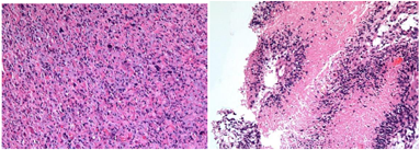 入院完善术前检查后于2017年6月7日行左额叶肿瘤切除术,术中见左侧额部约4cm×5cm大小占位,与上矢状窦、大脑镰相邻,颅底硬膜受侵犯,肿瘤质地软,呈鱼肉样外观,血供丰富,与周围脑组织分界不清。术后病理示:(左额叶)胶质母细胞瘤(WHO Ⅳ级)伴局部坏死,IDH突变型(图3)。免疫组化染色示肿瘤细胞:GFAP(部分+),S-100(+),Vimentin(+),Olig2(+),Syn(部分+),NF(灶状+),IDH(+),P53(+),ATRX(-),D2-40(-),NeuN(-),EMA(-),Ki67(热点区域Li: 15%)。分子病理结果显示:IDH1 R132H突变,TP53 R273C突变,ATRX野生型,TERT野生型,1p/19q无共缺失,MGMT启动子甲基化阳性(66%)。鉴于患者年龄相对年青,20年前有原位(额叶)脑肿瘤伽马刀治疗病史,IDH1基因突变,考虑诊断为继发性胶质母细胞瘤,IDH突变型。