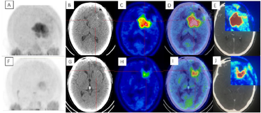 近年来新的影像技术的革新弥补了传统结构MR的不足,例如以弥散加权(DWI)、灌注加权(PWI)、波谱成像(MRS)为代表的MR功能成像[5,6]和以11C-MET 、18F-FET为代表的PET氨基酸代谢显像[7,8,9]都可以从不同的角度反映脑肿瘤的生物学特征。以鉴别肿瘤进展和治疗后改变为例,文献报道传统MRI汇总灵敏度和特异度分别仅约68%和77%,DWI汇总灵敏度和特异度分别约71%和87%,动态磁敏感增强灌注显像汇总灵敏度和特异度分别约87%和86%,MRS汇总灵敏度和特异度分别约91%和95%[10]。但MR功能序列目前也面临易受治疗后伪影干扰,采集和后处理缺乏标准化等不足。氨基酸代谢显像目前已被指南推荐广泛应用于脑肿瘤的术前诊断、术后评估、疗效评价、复发监测等多个环节[7] 。肿瘤生长旺盛,蛋白质合成活跃,氨基酸摄取显著高于假性进展、放射性坏死等治疗相关反应。11C-MET是应用最为成熟的氨基酸代谢显像剂,文献报道其鉴别高级别胶质瘤复发与治疗后反应汇总灵敏度达93%,特异度82%[11],有研究推荐以T/Nmean1.58为阈值区分复发胶质瘤与治疗后反应[12];一体化11C-MET PET/MRI鉴别肿瘤进展与治疗后反应准确度达96%,高于单独11C-MET PET (88%)和MR(82%),诊断信心更足[13]。目前仅有的为数不多的关于脑肿瘤免疫检查点抑制剂的疗效评价报道均是基于氨基酸代谢显像[14,15]。