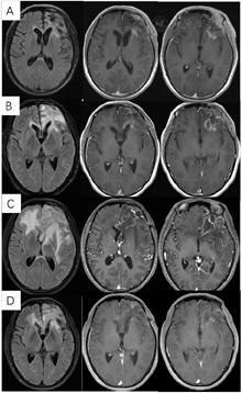 基于传统MR的RANO标准仅从FLAIR水肿范围、T1强化范围以及有无新增病灶进行评估,存在一定局限性。病情进展定义为:在激素用量不变或增加的情况下,增强病灶两垂直直径的乘积之和增加>25%;除外其他合并症因素后非增强病灶显著增大;出现任何新发病灶;非可测量病灶出现明显的进展;临床症状显著恶化;临床死亡[2]。约20%的胶质母细胞瘤患者同步放化疗后出现假性进展,多见于放化疗后3个月内,少数见于10个月内,常表现为原强化范围增大,但临床症状无进展,继续原方案治疗复查标准无变化或变小[3] 。其机制可能与放化疗后血管内皮细胞死亡、凋亡导致血管通透性增加有关,因此需要结合临床谨慎判断,4周后复查以确定为假性进展还是真性进展。放射性坏死多见于放疗6个月后,亦表现为病灶范围增大,强化程度增加,需要与肿瘤复发鉴别。对于免疫治疗、靶向治疗而言情况更为特殊,例如免疫检查点抑制剂治疗过程中肿瘤内细胞毒性T细胞浸润可导致假性进展,随后肿瘤负荷减轻,如果对假性进展认识不足,可能低估药物的疗效,导致对过早终止有效治疗的药物[4]。