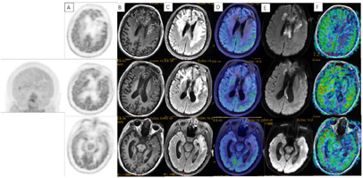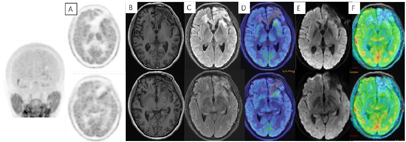 2018年3月、6月MR复查发现病灶范围逐渐增大(图6),提示不除外复发可能。患者除了轻微头痛之外并无明显不适,临床考虑假性进展,予安维汀100mg治疗后症状好转。2018年8月复查11C-MET PET/MR显像未见明显代谢增高病灶,证实为假性进展(图7)。2018年11月复查未见明显肿瘤复发,2019年3月2日MRI复查(图8)再次提示病变增大,考虑肿瘤进展。2019年3月行PD-1单抗(拓益)治疗,治疗过程中患者出现行走不稳,1月后患者不慎跌倒,外院就诊行颅脑CT未见明显出血。期间发现患者肝功能异常,给予护肝治疗后好转。2019年5月复查PET/MR(图9)提示左侧额叶前下部、左侧海马区及左侧颞叶前部蛋氨酸代谢较前次增高,其中左侧海马及左额叶直回ASL灌注相对增高,考虑复发可能,免疫治疗后存活。遂停用免疫治疗,根据患者全基因组测序结果选择靶向药物安罗替尼治疗(主要针对VEGFR、PDGFR、FGFR、c-KIT多个靶点),2019年12月复查PET/MR(图10)提示病变活性受抑。电话随访得知患者因武汉疫情影响无法按期治疗和复查,后合并肺部感染,于2020年8月去世。