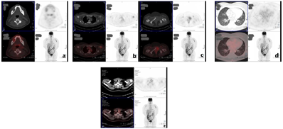 Li等[9]对1608例出现远处转移的甲状腺癌患者的研究数据表示对于中高分化的甲状腺癌患者,131I可以精准治疗转移病灶。Aubrey等[10]通过对一例FTC伴广泛脊柱转移的病例随访发现131I治疗的疗效具有一定的持久性,认为在经过131I治疗后且Tg呈进行性下降的过程中,患者暂时不需要立即做其他治疗。本例患者经过2次131I治疗后,通过观察及随访患者的Tg指标及影像学指标,提示患者病情较前改善。证明131I治疗对DTC伴肺、骨转移患者治疗的有效性,尤其对于那些摄碘效果良好的病灶的疗效更为显著。然而通过比较PET/CT及碘显像发现,本例患者的远处转移灶中,双肺转移瘤的18F-FDG阴性但131I阳性,而骨转移灶则呈现18F-FDG和131I均为阳性。通常来说,摄取18F-FDG的甲状腺肿瘤分化程度较低且侵袭性较高,而摄取131I则提示甲状腺肿瘤保留分化的特点[11],王丹阳等[12]研究认为18F-FDG和131I同时摄取的现象可能是由131I摄取阳性细胞失分化,使不同分化程度的肿瘤细胞共存于同一病灶内所致。18F-FDG和131I摄取的双阳性可能提示病灶具有失分化的倾向。因此该患者后续也有进展为碘难治性甲状腺癌的风险。