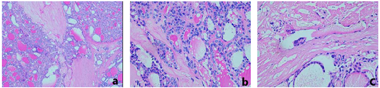 患者女性,50岁,于2020年4月无明显诱因出现左上臂肿痛,活动受限等症状,自行休息后未见明显缓解,遂就诊于当地医院,行X光片提示:左肱骨上段骨质破坏(图1)。后于2020年4月30日行PET/CT全身显像(图2)提示:甲状腺左侧叶混杂密度结节,代谢稍活跃;双肺多发结节,代谢活性未见明显增高;下颌骨右侧支、左侧肱骨上段、左侧耻骨及第4腰椎棘突骨质破坏,代谢活跃。为进一步明确诊断,患者于2020年5月14日在外院行"左肱骨中上段肿瘤广泛切除,人工肱骨头置换术",术后病理提示:符合甲状腺滤泡性癌转移。遂于2020年6月1日再次于该院行"双侧甲状腺全部切除术+颈部淋巴结清扫术(Ⅲ、Ⅳ及Ⅶ区)+喉返神经探查术",术后病理(图3)提示:1、(左侧甲状腺)广泛浸润性甲状腺滤泡癌,肿瘤大小5.0 cm×4.0 cm×2.0 cm,血管浸润>4个血管,未见明确神经侵犯;2、(右侧甲状腺)甲状腺滤泡性肿瘤,考虑为滤泡癌累及。为进一步治疗,患者于2020年7月28日、2021年1月13日入住我院行131I治疗。