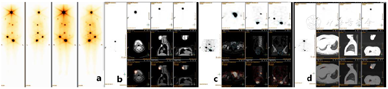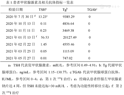 a:TSH代表促甲状腺激素,mIU/L,参考区间0.49~4.91;b: Tg代谢甲状腺球蛋白,ng/mL,参考区间1.15~130.77;c:TGAb代表甲状腺球蛋白抗体,IU/ML,参考区间0~4;d:第1次131I治疗;e:经确认患者停服左甲状腺素钠片达4周,但TSH未能达标>30 mIU/L ,考虑为功能性转移灶引起;f:第2次131I治疗