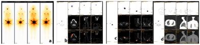 入院后完善相关检查后,根据2015版美国甲状腺协会(ATA)分化型甲状腺癌诊治指南、2018版美国癌症联合委员会(AJCC)和国际抗癌联盟(UICC)联合制定的第8版甲状腺癌TNM分期进行病情评估,患者肿瘤复发危险分层为高危,TNM分期为T3aN0M1,Ⅱ期。分别于2020年7月30日(250 mCi)、2021年1月15日(250 mCi)予以131I治疗,治疗后第3天行全身碘扫描及断层融合显像(图4,图5)。