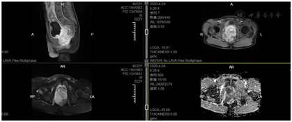 肛门指检:肛管内壁光滑,距肛门4cm处可触及约2.0×2.0cm肛管外侧占位,质硬,稍有触痛。急诊查泌尿系CT示:右侧盆腔膀胱旁软组织影,膀胱壁右侧局部增厚,前列腺增大、右后方精囊腺结构不清,右侧肾盂及输尿管积水。入院后行MRI检查:右侧盆腔为主占位伴膀胱右侧壁受累,两侧精囊腺显示不清,肿瘤可能性大(图1)。进一步行B超引导下经会阴前列腺及精囊腺旁肿物穿刺活检术。