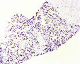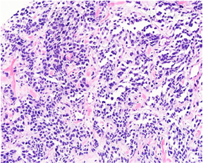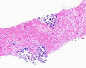 病理检查:送检双侧前列腺穿刺组织8条(左1至左4、右1至右4各一条),长度0.2cm~1.5cm,直径均为0.1cm。镜下观察:其中左2至左4可见良性前列腺腺体,其余5条均为纤维肌性脂肪组织,8条组织内均可见多灶呈小巢、片状以及腺泡样结构的幼稚深染短梭形或卵圆形肿瘤细胞增生、浸润(图2,图3),瘤细胞胞质稀少,核不规则,染色质深,核分裂象和凋亡小体多见,偶见胞质强嗜酸性的横纹肌母细胞样细胞,间质可见带状胶原纤维沉积和局灶的黏液变性(图4,图5)。免疫组织化学染色:肿瘤细胞弥漫核表达MyoD1(图6),大部分表达Myogenin(图7),部分表达结蛋白,弥漫表达CD56,Olig-2局灶表达,约5%(图8),ALK个别细胞表达,弥漫胞质表达WT1和波形蛋白,S-100蛋白阴性,Ki-67增殖指数约70%。荧光原位杂交(FISH)分别检测PAX3和FOXO1基因分离:PAX3和FOXO1基因重排均阳性(图9,图10)。