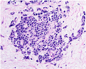 ARMS在组织形态上有三种类型:经典型、实体型和胚胎型-腺泡状混合型。经典型ARMS典型的病理特征是成片或巢状的小圆细胞被纤维血管间质分隔,巢中央的瘤细胞常因发生退变和坏死失去黏附性而脱落,或漂浮在腺泡腔内,形成特征性的腺泡状结构,与ERMS不同的是,ARMS中可见部分肿瘤细胞核位于嗜酸性胞质周边,可形成特征性的多核瘤巨细胞。实体型ARMS由弥漫成片分布的小圆细胞组成,呈实性胚胎样生长结构,腺泡状结构或纤维血管性间隔均不明显,肿瘤细胞无明显的横纹肌分化;所以实体型ARMS与致密ERMS镜下形态鉴别常存在一定困难,实体型ARMS肿瘤细胞形态呈单一形态的圆细胞伴有泡状染色质和不显著的核仁;致密ERMS肿瘤细胞形态呈成角的细胞核和大小不等的显著的核仁。胚胎性-腺泡状混合型除具有典型的ARMS病理特征外,局部区域显示ERMS的形态,可以看到不同分化阶段的横纹肌母细胞;但不推荐使用混合性胚胎及腺泡状横纹肌肉瘤,这类肿瘤多数缺乏PAX3/7-FOXO1融合基因,这些具有腺泡状型生长模式的融合蛋白阴性横纹肌肉瘤病例在基因表达特征、全染色体拷贝数变化和临床生物学行为方面与ERMS没有区别[4,5],因此更接近ERMS。