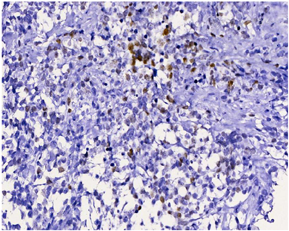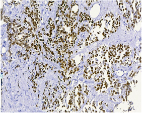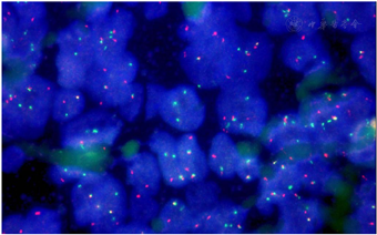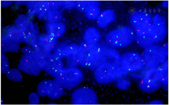免疫组织化学ARMS主要表达肌源性标志物结蛋白、myogenin和MyoD1,应用免疫组织化学在实体型ARMS和致密ERMS鉴别诊断中有一定帮助:(1)myogenin在ARMS中肿瘤细胞核呈弥漫强阳性,ERMS常呈局灶阳性;myogenin强弥漫表达与PAX3/7-FOXO1易位密切相关[6,7,8]。(2)69%~81%的ARMS可不同程度地表达ALK[9],可能呈局灶阳性;ERMS通常阴性(阳性率为6%-32%)。(3)新近文献报道OLIG2是ARMS中融合蛋白驱动的神经发育转录信号的标志物,有助于基因融合阳性病例的诊断和判断预后[10]。Olig-2在ARMS通常阳性(FOXO1重排横纹肌肉瘤病例中约96%阳性),可能仅局灶表达,ERMS通常阴性。本例Olig-2呈局灶表达。(4)最近的一篇文献报道MUC4在大多数PAX3/7- FOXO1融合阳性ARMS中有不同程度的表达,而在其他横纹肌肉瘤亚型中罕见表达[11]。(5)PAX5也有助于识别基因融合阳性的ARMS[12]。此外,除MUC4外,ARMS表达其他一些上皮分化特征的标志物,例如,大约一半ARMS表达广谱角蛋白,横纹肌肉瘤偶尔也表达突触素, chromogranin A和INSM1,可被误诊为小细胞癌或差分化神经内分泌癌。ARMS还可程度不等地表达CD99,易误诊为原始神经外胚层肿瘤。因此免疫组织化学标记有时可能会是诊断陷阱,病理医师应避免误诊或漏诊。据文献报道,80%的ARMS病例存在染色体易位,其中60%病例表现为t( 2 ;13)(q35;q14),导致PAX3-FOXO1融合,20%的病例为t(1;13)(p36;q14),导致PAX7-FOX01融合基因[13]。这些异常在核型上与ERMS中常见的11p15.5杂合性丢失差别很大。