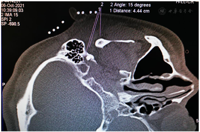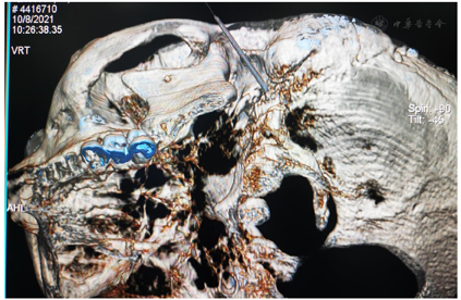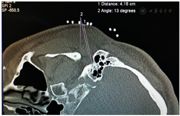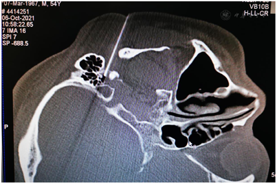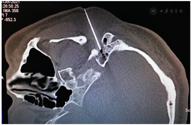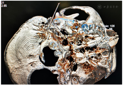 鉴于MS与HFS的临床表现有高度相似之处,我们设想,用于治疗HFS的面神经射频技术有望用治疗MS。经报请医院伦理委员会讨论通过(LS2019-013),决定给患者施行双侧面神经射频治疗。术前向患者及其家属详细交待操作经过和可能出现的轻度面神经麻痹并发症,取得知情同意并签署书面知情同意书后,嘱患者右侧向上侧卧于CT台上,安置血压、心电图、脉搏血氧饱和度监测设施并给予鼻导管吸氧,并在耳垂前后放置CT定位定位栅(图2)。用鼻旁窦模式拍摄头颅定位像,并对乳突区进行层厚3 mm轴位扫描,选取含茎乳孔且无颞骨鼓部骨质阻挡的CT层面作为穿刺层面,并在该层面上设计穿刺路径:以右侧茎乳孔为穿刺靶点,用CT自带测量工具软件由右茎乳孔向前上拉直线,该线与皮肤的交点即为穿刺点,测量穿刺深度(穿刺点至靶点的距离)和穿刺角度(穿刺路线与矢状面的夹角)(图3)。对穿刺点进行局部麻醉,用长度为10 cm、裸露端为5 mm的7号射频针在CT引导下穿刺至靶点(图4)并CT扫描三维重建观察确认(图5),随后用低频(2 Hz)电流进行运动神经刺激测试,0.5 mA电流电刺激即能诱发出右侧面肌出现与电刺激相同频率痉挛性抽动,见视频,给予65℃标准射频消融,同时嘱患者鼓腮、闭眼,射频第27秒鼓腮漏气,右眼不能紧闭,即停止射频,结束手术,见视频。2 d后同样于CT引导下行左侧茎乳孔穿刺面神经射频消融治疗(图6,图7,图8)。