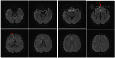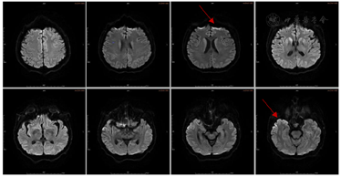 入院第6天查体较前变化体征为:双上肢肌张力略增高,双侧指鼻试验、轮替试验、跟膝胫试验等共济运动欠灵活,步态不稳,需搀扶,双侧腱反射对称(+++),双侧踝阵挛(+),双侧Babinski’s征(-),脑膜刺激征(-),余查体同前。入院第6d精神检查:神志淡漠,表情呆愣,多数时间下为亚木僵状态,对问话较前有反应,张口说话困难,反复提问下可回答几个字,对一些医生的交谈可以有笑容、自嘲的表现,对大多数交谈内容反应不明确;对命令要求可有反应,但难以配合;可疑认知功能减退(患者对检查欠配合),双手姿势怪异,无自知力。2020年12月15日头颅MRI示右侧额颞顶枕叶、左侧额叶、右侧尾状核头可见DWI高信号(图1)。于2020年12月15日转诊至外院神经内科就诊。