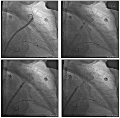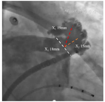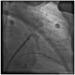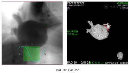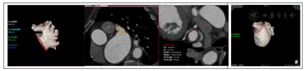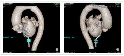 为缩短手术时间及减少手术步骤,术前同时采用CT评估了最佳展开体位及理想的穿刺部位。采用CT模拟后发现在RAO30 CAU25时为最佳工作体位(图3)。由于左心耳常规穿刺部位为靠下靠后,但通过CT模拟后发现当靠下靠前穿刺房间隔可以保持更好的轴向,利于术中的操作(图4)。