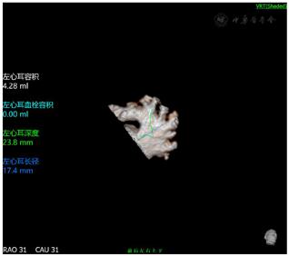 为进一步行评估左心耳结构特点,因此为患者进一步安排CT评估,CT提示左心耳内未见血栓,三维重建后左心耳呈低位,反鸡翅型,开口椭圆形,最短径17.3mm,最长径21.7mm,三维深度19.1mm,二维深度18.0mm,内部梳状肌较为发达。(图1)