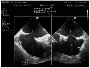 由于该患者术中需要精确房间隔穿刺,因此采用常规全麻+TEE指导术式,TEE指导下选择了偏下、偏前的房间隔穿刺部位(图5)。