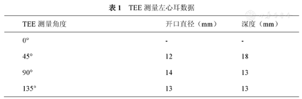 入院后常规检查未见明显异常,心动超声提示左房增大伴二尖瓣中量反流,LA前后径40mm。该患者入院后根据CHA₂DS₂-VASc评分及HAS-BLED评分来进一步评估其卒中及出血风险,该患者CHA₂DS₂-VASc评分4分,HAS-BLED评分3分,属于高卒中及高出血风险患者。因该患者仍有心悸症状发作,且多次服用抗凝药物后有上消化道出血表现,故向患者及家属建议行房颤射频消融及左心耳封堵一站式手术。术前进一步行食道超声明确左心耳是否存在血栓及形态,术前食道超声提示心耳内未见血栓,心耳偏小,在90°上可能呈反鸡翅型(表1)。