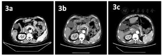 2021年9月11日胸腹平扫+增强CT提示:(1)食管癌治疗后,请结合临床及老片;(2)考虑右肺放疗后改变,右下肺结节较2021年7月22日片明显缩小;右侧胸膜增厚;(3)升主动脉增粗,主动脉及冠状动脉粥样硬化;(4)右肾小囊肿,右肾结石;(5)左肾未见明显显示,左肾上腺结节、腹腔及腹膜后结节、左胸壁皮下结节及肝右叶异常强化影,较前片2021年7月22日片相仿(图1,图2,图3)。