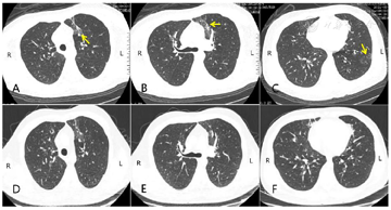 1周后第一次随访,患者哮喘症状控制良好,复查胸部CT及肺功能(极重度阻塞性通气功能障碍)。3周后第二次随访,患者未诉哮喘症状,并再次复查胸部CT及肺功能(通气功能基本正常)。3个月后电话随访,患者仍进行奥马珠单抗治疗,并规律吸入沙美特罗替卡松气雾剂,症状控制良好。