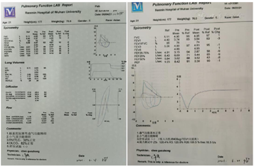治疗期间患者病情演变(图2),多次复查胸部X线片(图3),10天后好转。随访患者哮喘控制症状、胸部CT(图4)及肺功能(图5)。检查局限性:患者病情危重,由于ECMO仪器特殊性及管路因素,未完善肺功能及胸部CT检查。