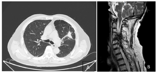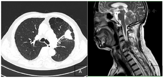 实验室检查:血细胞分析:红细胞2.93×10^12/L↓;血红蛋白103.00g/L↓;白细胞3.40×10^9/L↓;中性粒细胞绝对值1.77×10^9/L↓;肝功能:白蛋白37.50g/L↓;总蛋白58.00g/L↓;电解质(血液):钾3.44mmol/L↓;免疫功能检测提示多项指标低下。影像学检查:脑MRI、全身骨扫描、腹部彩超未见明显异常。胸部CT增强(治疗前后):2021年5月左肺上叶前段软组织密度影(4.3×2.4cm)(图1)。治疗后左肺上叶舌段肿块(大小约2.5×1.6cm),较前减小(图2)。颈椎MRI(治疗前后):2021年5月颈5椎体病理性骨折、左侧椎旁软组织肿块形成(图1)。治疗后左侧椎旁软组织肿块较前缩小(图2)。
