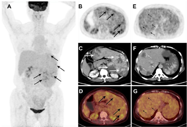 肝脏病灶需考虑:(1)肝血管瘤:18F-FDG PET/CT及增强CT表现与脾血管瘤类似,本例影像表现与血管瘤相符。(2)肝转移瘤:病灶周边常有持续性环形强化,18F-FDG PET/CT有助于鉴别,肝转移瘤一般18F-FDG代谢增高,且显像常能发现原发肿瘤病灶。本例除了肝脾占位以外,并无其他可疑的原发病灶,肿瘤标志物亦正常,如果脾脏为PSA,考虑到PSA易于转移的特点,肝转移瘤无法排除,但肝脏病灶的代谢正常,似乎又与转移瘤不符。(3)肝细胞肝癌:肝癌的18F-FDG代谢与其分化程度相关,增强CT有助于鉴别肝癌,其增强表现为"快进快出",与本例不符。(4)肝脓肿:病史及实验室检查可资鉴别,且18F-FDG FDG代谢可明显升高,本例不符合。