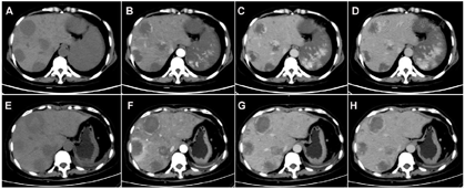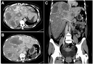 术后1个月复查腹部CT提示肝脏病灶较术前增大。术后7个月再次因腹胀入院,查腹部CT示肝内弥漫性结节及肿块,腹腔内多发结节。随访结果提示术前肝脏病灶为转移瘤,术后病灶明显进展。