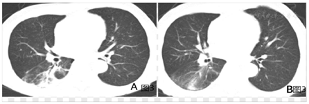 患者转入呼吸ICU后,积极给予呼吸支持治疗、抗感染、抗炎、补液、纠正电解质紊乱及保肝、护胃、营养支持等对症支持治疗,患者体温逐渐下降,大便情况好转,肝酶、肌酶、血小板指标逐渐好转,2020年9月28日神志转清,具体病情转归情况见表3,表4。2020年9月30日转出RICU至普通呼吸病房,10月8日复查胸部CT示右下肺炎症明显好转(图3A),病情稳定后于2020年10月18日顺利出院。11月20日来院复查右下肺炎症进一步好转(图3B)。