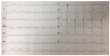 患者,男性,26岁,因"晕厥3 d"于2019年1月12日入院。患者3 d前无明显诱因下在上课时突发意识丧失,无四肢抽搐,无口吐白沫,无二便失禁,约2 min后意识自行恢复。发作前后无胸闷胸痛,无恶心呕吐,无头晕头痛。既往史:否认高血压、冠心病、心律失常、糖尿病和脑血管疾病病史。否认吸烟史,否认心血管病和猝死家族史。