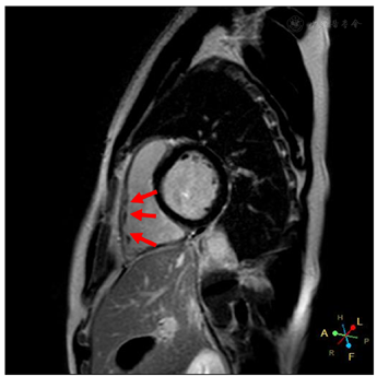ARVC是由编码桥粒蛋白的基因突变引起心肌细胞间连接中断,心肌细胞坏死并被纤维脂肪组织替代。ARVC早期可单纯表现为起源于右心室的室性心律失常,晚期右心结构改变较突出,表现为右心室整体和局部扩张及功能障碍,伴明显的局部运动障碍。因此Brugada综合征与ARVC在突变基因型、有无明显的心肌病改变、心律失常的发生机制及预后方面均存在显著差异。本例患者心脏超声提示右室流出道增宽,核磁显示右室心肌纤维化,而基因检测无桥粒基因突变,心电图未发现Epsilon波,根据ARVC诊断标准(2010)专家共识的评分标准[6],本例患者尚不能诊断ARVC,但研究显示对于Brugada综合征伴有右心室结构异常的患者,发生室性心动过速风险更高,因此对于这类高危人群进一步随访尤为重要。