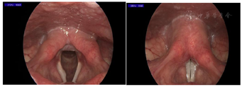 患者,女性,43岁,因声嘶1个月入院。患者个1月前说话多后出现声嘶,呈持续性,伴发音粗糙、发声费力、音域受限等不适,CAPE-V嗓音听感知评估:嗓音障碍总的严重程度中度,粗糙声中度,气息声中度,紧张声轻度,无力程度轻度,音调异常轻度。反流症状评分:14分;反流体征评分:8分。频闪喉镜考虑右侧声带囊肿,在全麻下行"支撑喉镜辅助下右侧声带囊肿切除术",术后20天复查,患者诉仍声嘶、发声费力等不适。