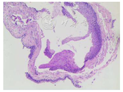 根据持续声嘶症状,嗓音粗糙度中度,频闪喉镜检查可见右侧声带囊样新生物,病变黏膜波减退,诊断右侧声带囊肿,咽喉反流性疾病。在全麻下行支撑喉镜下显微镜辅助声带囊肿切除术,围手术期配合气流轻声发声训练指导及抗反流治疗。术中见右侧声带前中交界处有一囊肿样物,淡黄色,表面光滑,基地较宽,活动度稍差;采用显微中间微瓣法行声带囊肿剥离手术:显微喉镰刀行囊肿黏膜旁纵切口,并用30°喉显微剥离子行囊肿黏膜下剥离,见囊肿深及声带的系膜层,牵拉囊壁,完整剥离囊肿,并用显微喉剪行囊肿根部切除,将声带黏膜复位。术后予激素雾化、质子泵抑制剂抗反流、喉部微波理疗等处理,绝对禁声3 d,气流轻声发声1周。术后病理示:符合声带囊肿(图2)。