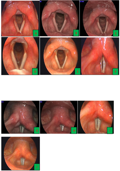 术后第1天复查频闪喉镜:可见右侧囊肿消失,声带边缘光滑,右侧声带黏膜波稍下降,未见明显肿物残留,轻度充血肿胀。喉后部充血,黏膜轻度增生,发音时,可见声门闭合见一梭形缝隙(图3A、图3F)。