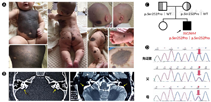 体格检查:发育正常,营养良好。身高108 cm(+1SD),体重20.5 kg(+2SD)。胸腹部皮肤可见巨型的黑棕色皮肤色素斑块,直径超过20 cm似"肚兜"状兽皮痣,边缘呈锯齿状,左侧边缘延伸至背部;除面部外,全身其他各处均有散在"泼墨样"皮肤色素斑块、大小不一、颜色深浅不一,部分伴周边卫星样痣(图1A)。脊柱、四肢发育无畸形,关节活动自如。