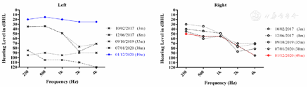 患儿分别于出生后3个月、8个月、35个月、38个月在我科进行ASSR测试,检测前准备与ABR相同。对比这四次测试结果,左耳平均听阈在35个月大时由中度听力损失进展为极重度耳聋,而右耳平均听阈稳定在中度听力损失。患儿的双耳听力变化不对称,呈现左耳进展型、右耳稳定型的听力学特征(图2)。