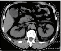 辅助检查:血常规:WBC 25.7×109/L,NE 60.2%,PLT 49×109/L。肝肾功能:ALT 360 U/L,AST 175 U/L,CREA 207 μmol/L。凝血:PT 16.7 s,APTT 74.7 s。心电图:窦性心动过速。完善胸部CT检查:未见明显异常(图1)。腹部CT:肾脏形态不规则,体积局部增大,周围渗出边缘毛糙(图2)。