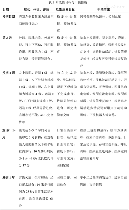 | 发病2周 | 左上肢肌力近端1级,远端0级,左下肢肌力近端1+级、远端0级,右上肢肌力近端0~1级、远端0级,右下肢肌力近端1级、远端0级;经鼻胃管进食;言语表达不能;ADL完全依赖 | 独立完成卧坐、坐站转移;帮助下或辅助下完成步行;拔除胃管经口进食;可完成简单交流 | 抗血小板、降脂稳定斑块、降压等药物治疗;肢体被动运动为主;吞咽言语训练、呼吸训练、四肢肌肉电刺激、经颅直流电刺激、经颅磁刺激、针灸等康复治疗;根据患者运动进步情况逐渐增加主动运动训练、下肢机器人等训练。 |