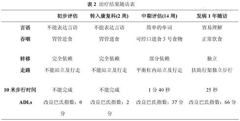 患者入我科时双侧肢体无力,伴进食、言语不能,眼球可垂直运动,可闭眼及睁眼,结合影像学结果,诊断为闭锁综合征,病因为脑梗死。入院时为发病2周,当时四肢肌力0~1级,停留胃管及尿管,不能言语。出院后1年评估患者言语理解完全正常,言语表达较为流利,可完成日常交流,能安全地进食正常食物,可以在无他人帮助的情况下扶助步器辅助行走,其10米步行时间为25秒,MBI评估66分(具体预后情况见表2)。