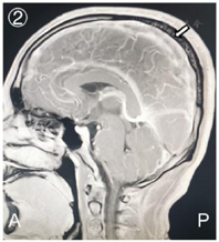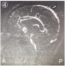入院后给予脱水降颅压、低分子肝素桥接华法林抗凝、丙戊酸钠抗癫痫、床旁肢体康复等治疗措施,控制INR在2~3之间,患者意识逐步恢复清醒,认知功能未见明显障碍,头痛症状明显缓解,未见肢体抽搐等症状发作,右侧肢体功能明显改善,肌力恢复至5-级,复查头颅CT(2020年11月19日)提示:左侧额叶、右侧颞叶出血灶较前吸收减少(图3);头颅MRV(2021年12月5日):右侧横窦纤细,乙状窦部分显示不清,上矢状窦管壁毛糙、粗细不均,对比前片有所缓解(图4)。