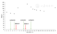 患者输血前血红蛋白(Hb)76g/L,白细胞计数(WBC)2.08×109/L,血小板计数(PLT)152×109/L,丙氨酸氨基转移酶(ALT)8.0U/L,天冬氨酸氨基转移酶(AST)9.2U/L,总胆红素(TBIL)7.4μmol/L(参考值0~21.0μmol/L),直接胆红素(CB)2.8 μmol/L(参考值0~8.6μmol/L),间接胆红素(UCB)3.6μmol/L(参考值0-12.4μmol/L),乳酸脱氢酶(LDH)173.4U/L(参考范围40~250U/L)。第二次输血后出现不明原因Hb下降,最低降至78g/L,详见图1;溶血指标轻度上升,TBIL最高至15μmol/L,UCB最高至10.2μmol/L,LDH最高至209.3U/L,胆红素检测指标详见图2。
