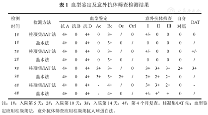 注:1#:入院第5天;2#:入院第10天;3#:入院第14天;4#:第4个月复查。柱凝集/IAT法:血型鉴定应用柱凝集法,意外抗体筛查应用柱凝集抗人球蛋白法。