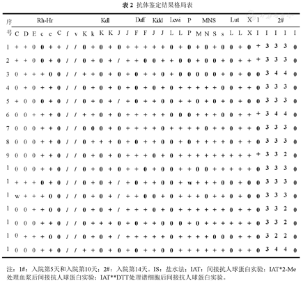 注:1#:入院第5天和入院第10天;2#:入院第14天。IS:盐水法;IAT:间接抗人球蛋白实验;IAT*2-Me处理血浆后间接抗人球蛋白实验;IAT**DTT处理谱细胞后间接抗人球蛋白实验。