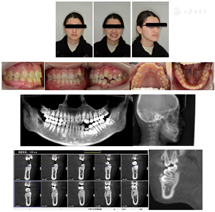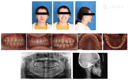 该患者恒牙列,磨牙近中关系。上颌牙列轻度拥挤,74牙下沉,34牙未萌,左下第一尖牙(33)冠向远中倾斜,左下第二恒前磨牙(35)冠向近中倾斜。