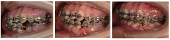矫治过程:初戴时上下颌全口牙列黏结Tip-Edge Plus托槽及磨牙颊面管,上下颌牙列放置0.014镍钛丝。上颌弓丝更换的顺序为:0.016镍钛丝,0.018镍钛丝,0.016×0.022镍钛丝,0.018×0.025镍钛丝,0.018×0.025不锈钢方丝。下颌弓丝更换顺序为:0.016镍钛丝,0.018镍钛丝,0.020不锈钢圆丝,0.016×0.022镍钛丝,0.018×0.025镍钛丝,0.018×0.025不锈钢方丝。下颌弓丝更换至0.020不锈钢圆丝时,口腔外科拔除74牙,34牙开窗,黏结牵引装置。牵引装置与下颌弓丝之间弹性牵引。同时为防止埋伏牙两侧的牙齿因受牵引力向中间倾斜,在33牙位的托槽上安装牙根向远中倾斜的正轴簧,35牙位的托槽上安装牙根向近中倾斜的正轴簧。待34牙冠完全萌出后,34牙去除牵引装置,黏结托槽,在主弓丝为0.020不锈钢圆丝不变的前提下,于下颌托槽的辅弓管内放置0.012 NiTi丝辅助排齐,待34牙冠牵引到正常高度后,34牙位的托槽安装牙根向近中的正轴簧用来竖直牙根。最后阶段精细调整,对齐上下颌中线,关闭剩余间隙(图2)。