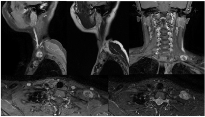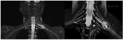 颈部MR平扫+增强及臂丛神经MRI-3D重建显示左颈部占位考虑神经源性肿瘤可能性大。