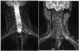 术前颈部MR平扫+增强(图1)与术前MRI-3D臂丛神经重建(图2)