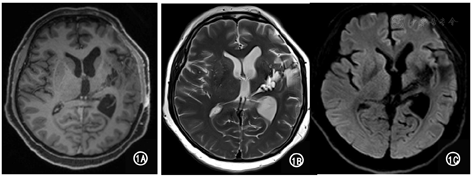 入院后专科查体:左侧肢体肌力、肌张力正常,右侧近端肌力3级、远端肢体肌力0级,肌张力明显增加,感觉未见明显异常。右上肢运动功能:Fugl-Meyer运动功能评分2分(总分66分);华山分级:Ⅰ级;改良Ashworth分级:3级。头颅核磁平扫示:左侧基底节区、丘脑软化灶,左侧额颞叶萎缩,侧脑室增宽,如图1所示。