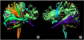 磁共振张量成像:左侧基底节区、额颞叶软化灶伴左侧皮质脊髓束、左侧皮质核束损害伴重塑改变;左侧胼胝体纤维减少;双侧视辐射尚对称,如图2所示。
