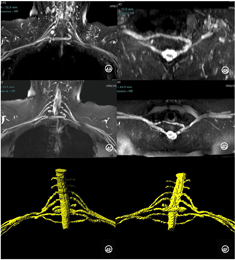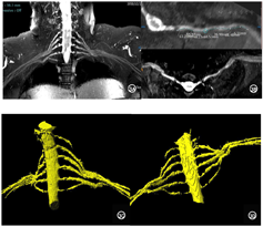 为明确臂丛神经、周围动静脉关系情况进行精准术前规划、减少神经血管损伤,患者进行了基于增强前后三维短时反转恢复各向同性变翻转角激发序列(3D-T2-sampling perfection optimized contrasts by using different flip angle evolution short time inversion recovery,T2-SPACE-STIR)的臂丛神经高分辨MRI检查。