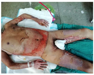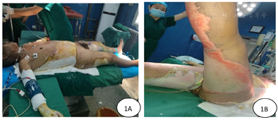 烧伤创面主要位于躯干及四肢,体表总面积(TBSA):60%(深二度35%、三度12%),基底红润到红白相间至苍白不等;肢端凉、足背动脉搏动细弱。