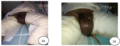 8月29日(伤后9 d,第2次术后1 d):患者阴囊开始肿胀(图2),血生化检查提示:总蛋白和白蛋白均低,初步没有考虑血管病变,认为是低蛋白血症所致,继续加强血浆与白蛋白的输注、观察效果。8月30日至9月3日:积极补充胶体后,患者阴囊肿胀不但未缓解而且呈加重趋势;创面情况:左上肢、双下肢手术创面皮片定植良好,右上肢未手术偏浅创面在上皮化中,躯干后侧及侧胸创面磺胺嘧啶银(SD-Ag)暴露制痂干燥;体温仍无明显升高,感染可能性较小,低蛋白或回流受阻可能性较大,继续补充血浆、白蛋白,请泌尿外科会诊:考虑低蛋白血症,加强胶体补充。